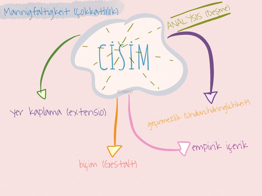 Analitik önermelerde yüklem her seferinde özneden daha az bir şeye işaret eder dediydik. O halde “cisim” kavramının içerisinde “yer kaplama” dışında başka neyi ya da neleri düşünüyoruz bunu da tekrar önerme biçiminde serelim. Sözgelimi: “Tüm cisimler bir biçime iyedir.” Empirik olan “cisim” kavramı bölündükte içerisinden “biçim” (Gestalt) kavramı da çıkartılır. Karşımızda bu türden bir Görünüş (biçime iye olan ve “cisim” kavramının içerisinde düşünülen öteki kavramlara göre olan) çıktığında buna da “cisim” deriz.