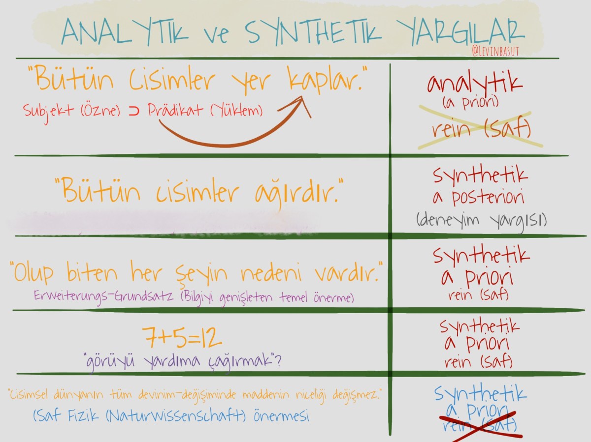 Buraya kadarki kısımda “tüm cisimler yer kaplar” önermesinden ayrıntıda söz ettik. Bu önermenin analytik olmaklığı üzerine konuştuk ve nasıl kurulduğunu serdik. Bu önermeyi kurarken, bölmekten, deşmekten başka bir şey yapmadığımız için, duyumsamaya ve deneyime tekrar gitmediğimiz için (“cisim” kavramını kurarken duyumsamaya ve deneyime elbette gitmekteyiz) önermeyi kurarken yaptığımız iş a priori‘dir. Analysis işlemi zaten halihazırda a priori iş gördüğümüzü imler. Analytik olanın a priori olarak ayrıca nitelenmesine gerek yoktur. “Analytik a priori” totolojik bir kurmadır. Burada yapılan işin ve yöntemin açık kılınması ile, a priori ifadesini analytik sıfatına eklemenin, bütünüyle anlamsız olduğu açığa çıkmakta.